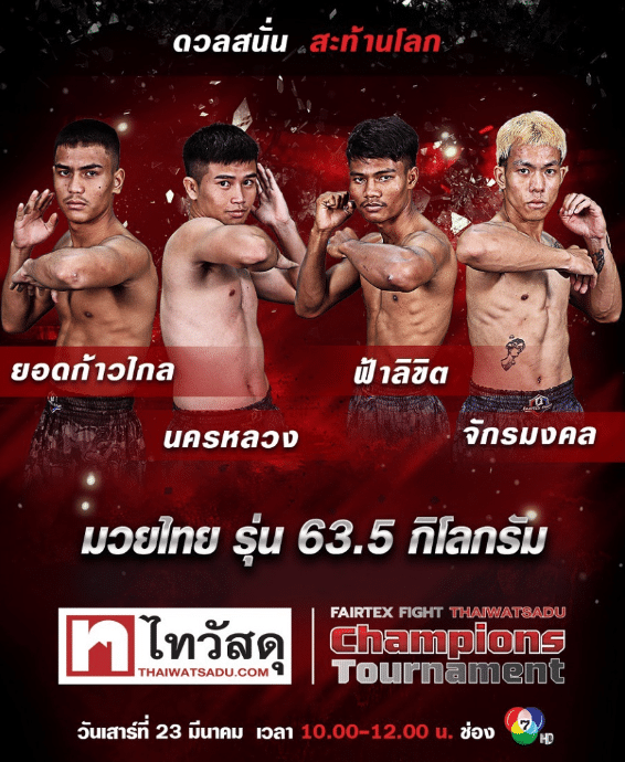 จากนั้นวันหยุดสุดสัปดาห์ เสาร์ที่ 23 มีนาคมนี้ พบกับ Fairtex Fight มวยมันพันธุ์ EXTREME เกมการต่อสู้สุดร้อนแรง มาพร้อมโปรดักชันสุดล้ำบนเวทีสนามมวยลุมพินี (รามอินทรา) ยกระดับมวยไทยสู่ระดับอินเตอร์ สัปดาห์นี้เดินทางมาถึง Semi Final รอบตัดเชือกของ Fairtex Fight X ไทวัสดุ Champions Tournament เสาร์นี้รู้กันว่าใครจะเป็น 2 คนสุดท้าย