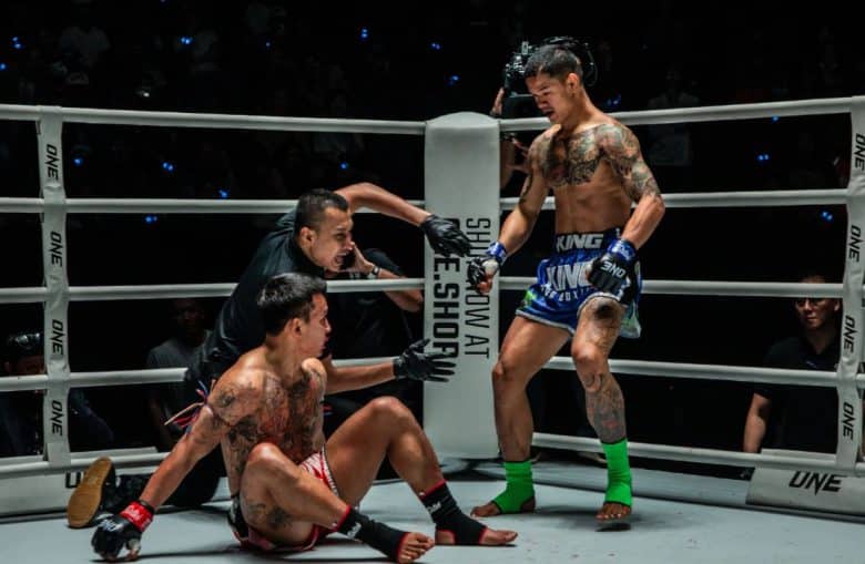 ที่สนามมวยเวทีลุมพินีใน ศึก ONE ลุมพินี 6 ก้องธรณี ส.สมหมาย น็อก กิ่งซางเล็ก ต.หลักสอง ยก2ในกติกามวยไทย